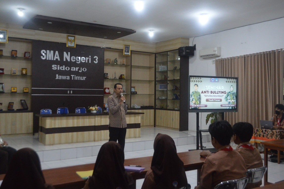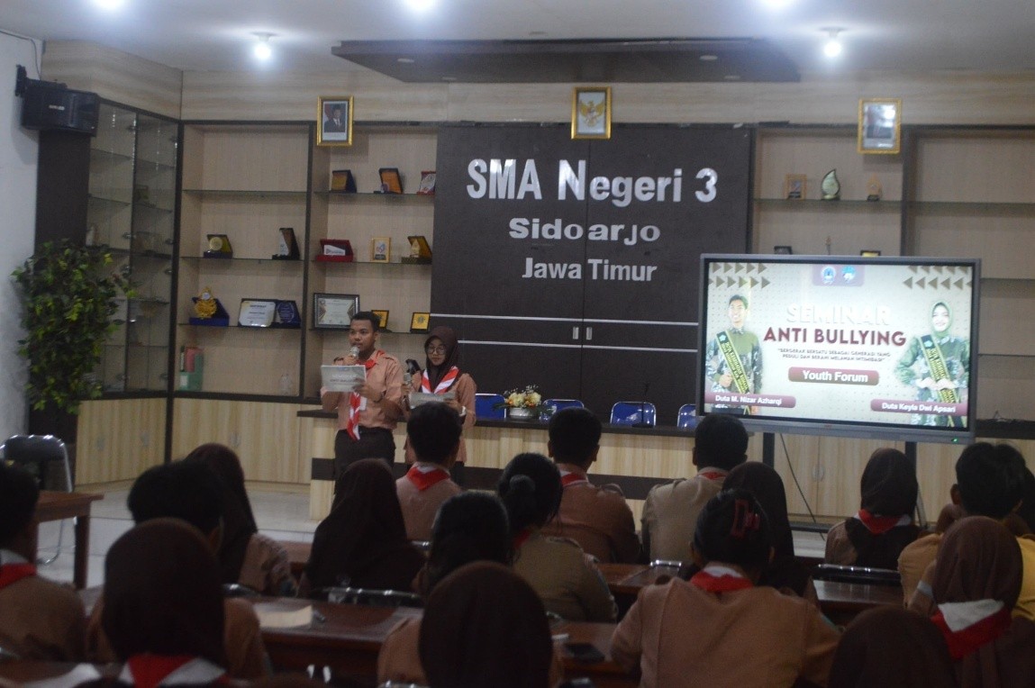 Pada hari Jumat, 24 Oktober 2025 telah dilaksanakan kegiatan Seminar Anti Bullying 2025. Kegiatan ini bertempat di ruang meeting SMA Negeri 3 Sidoarjo dengan menghadirkan narasumber dari komunitas Youth Forum, yang dikenal aktif dalam kampanye kesadaran sosial di kalangan remaja. Seminar ini diikuti oleh lima perwakilan dari tiap kelas X, yang dipilih untuk menjadi duta anti perundungan di lingkungan sekolah. Para peserta terlihat antusias mengikuti rangkaian kegiatan yang terdiri dari sesi penyuluhan, diskusi interaktif, hingga simulasi situasi yang sering terjadi di sekolah terkait tindakan perundungan.