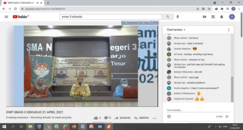 Seminar online yang diadakan Selasa (20/4) itu mengambil tema Dengan Semangat Perjuangan Ibu Kartini Kita Tingkatkan Peran Wanita dalam Memajukan Pendidikan. Pada seminar online ini di buka oleh Ibu Kepala SMAN 3 Sidoarjo Dr. Ristiwi Peni, M.Pd. ’’Perempuan Indonesia sebagai sosok pendidik keluarga dan juga lingkungan, harus mengambil peran untuk meningkatkan mutu pendidikan di lingkungan,’’ urai Ibu Kepala Sekolah.