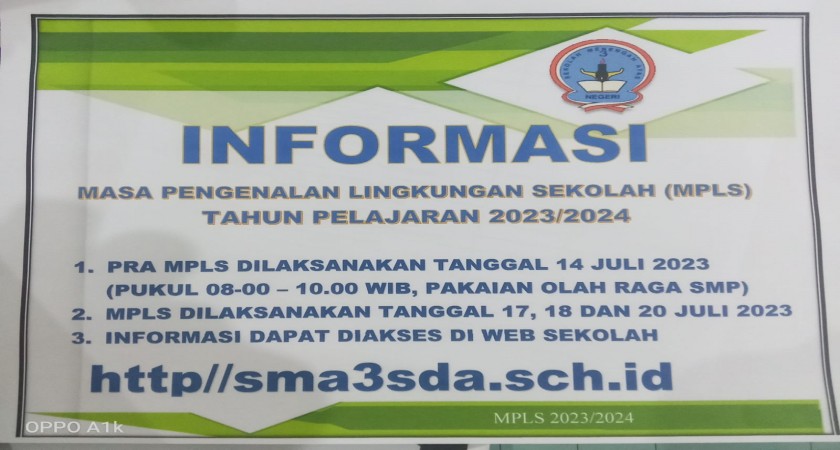 Assalamualaikum wr.wb, Selamat SiangPengumuman untuk Peserta Didik Baru SMA Negeri 3 Sidoarjo bahwa kegiatan MPLS dilaksanakan secara daring dengan metode zoom (saat upacara pembukaan)