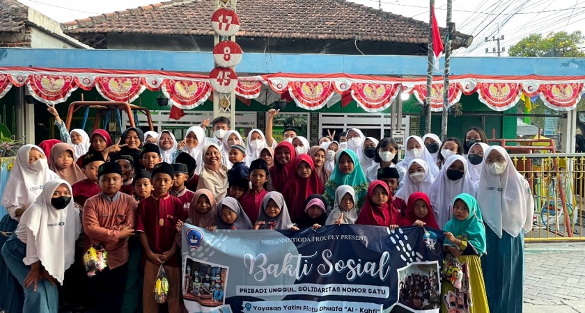 Rabu, 31 Agustus 2022 OSIS Smantigda menjalankan program kerja yaitu bakti sosial akhir periode yang rutin dilaksanakan setiap tahunnya. Dimana untuk periode 2021/2022 saat ini OSIS mengadakan bakti sosial ke Yayasan Yatim Piatu Dhuafa Al-Kahfi di Jl. Raya Kemiri no.110, Kemiri, Kec. Sidoarjo, Kab. Sidoarjo. Kegiatan ini diselenggarakan dengan tujuan mengajarkan dan menumbuhkan rasa solidaritas kepada peserta didik SMA Negeri 3 Sidoarjo untuk saling peduli terhadap sesama serta pembentukan sikap kepekaan terhadap lingkungan sosial. Penggalangan dana diikuti oleh seluruh warga Smantigda dari peserta didik kelas 10, 11 dan 12, guru, serta karyawan SMA Negeri 3 Sidoarjo.