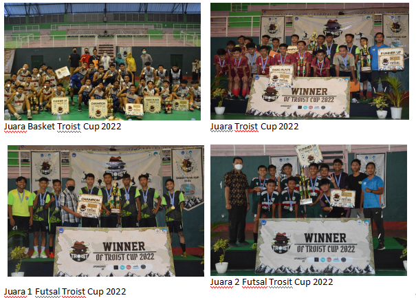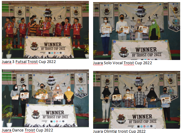 Sempat dihentikan beberapa minggu karena situasi dan kondisi yang tidak memungkinkan, kegiatan Troist Cup 2022 akhirnya berhasil dituntaskan dengan sangat baik. Rangkaian kegiatan Troist Cup 2022 ditutup dengan Closing Ceremony dan juga pembagian hadiah untuk para pemenang kompetisi pada tanggal 18 dan 19 Maret 2022 dengan dihadiri kepala sekolah dan jajaran waka kesiswaan serta para guru pembina sekbin. Berbagai piagam, piala, sertifikat, serta hadiah diserahkan secara simbolik kepada para perwakilan setiap tim pemenang oleh Bapak Bambang Wahyudi M.Pd., Bapak Asnan Wahyudi S.Pd., Bapak Syaiful Arif, S.Or., M.Pd., dan Ibu Anis Suryani, S.Pd. Dan semua rangkaian kegiatan Troist Cup tetap menerapkan dan mematuhi protokol kesehatan.