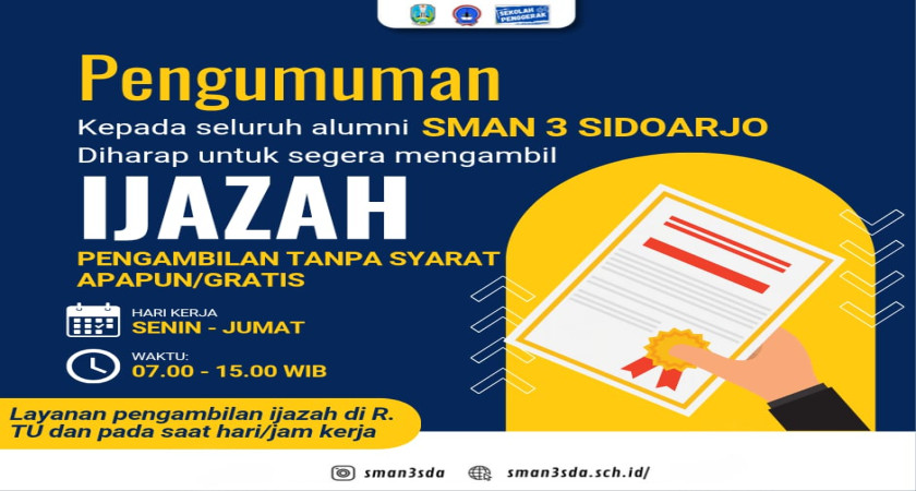 Buat kakak - kakak alumni SMAN 3 Sidoarjo yang belum mengambil ijazah, yuk segera ambil di sekolah