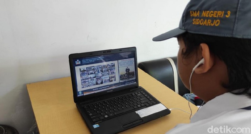 Dari pantauan detikcom, Kasek SMA Negeri 3 Sidoarjo Ristiwi Peni menyimak sambutan Gubernur Jatim untuk untuk anak didik baru secara online. MPLS di SMA Negeri 3 Sidoarjo tahun ajaran 2020/2021 ini digelar via zoom dan youtube paling lama 3 hari pada minggu pertama.