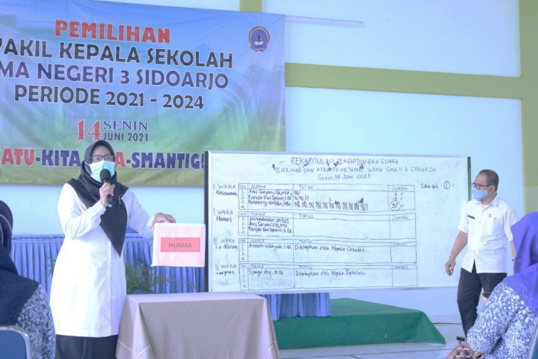 Selanjutnya, Senin, 14 Juni 2021 bertempat di Gedung Aula SMAN 3 Sidoarjo dilaksanakanlah proses pemilihan wakil kepala sekolah dengan menerapkan Protokol Kesehatan Covid-19.